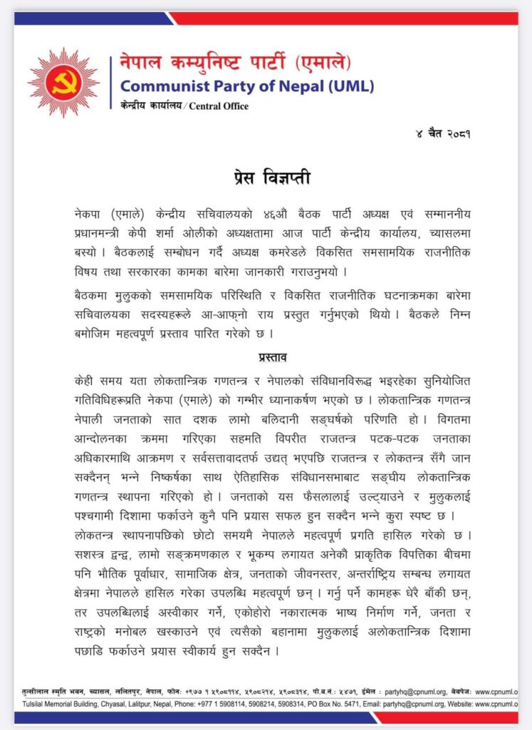 नेकपा एमालेद्वारा गणतन्त्रको रक्षा गर्ने विशेष प्रस्ताव पारित