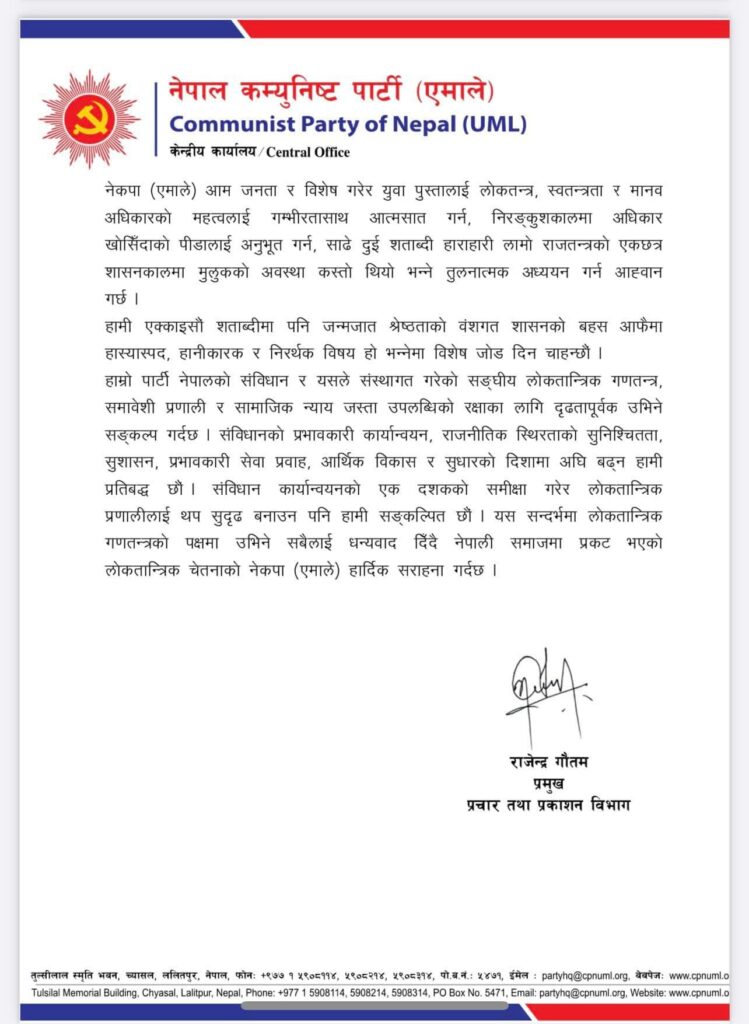 पछिल्लो समय गणतन्त्र र संविधानप्रति भइरहेका सुनियोजित गतिविधिहरूप्रति पार्टीको गम्भीर ध्यानाकर्षण रहेको एमालेले जनाएको छ। उपमहासचिव ज्ञवालीले लोकतान्त्रिक गणतन्त्र नेपाली जनताको सात दशक लामो संघर्षको परिणाम भएकाले यसको रक्षा अनिवार्य रहेको उल्लेख गरे।