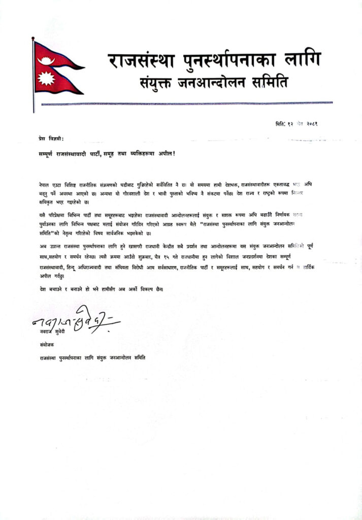 ‘आउँदो शुक्रबार राजधानीमा हुन लागेको विशाल जनप्रदर्शनमा देशका सम्पूर्ण राजसंस्थावादी, हिन्दू अधिराज्यवादी तथा संघीयताविरोधी आम सर्वसाधारण राजनीतिक पार्टी र समूहहरुलाई साथ, सहयोग र समर्थन गर्न म हार्दिक अपील गर्छु । देश बचाउने र बनाउने हो भने हामीसँग अब अर्को विकल्प छैन’, उनले विज्ञप्तिमा भनेका छन् ।