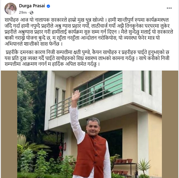 उनले भनेका छन ‘प्रहरीकै दमनका कारण निजी सम्पत्तीमा क्षती पुग्यो, कैयन साथीहरु र प्रहरीहरु घाईते हुनुभएको छ यस प्रति दुख व्यक्त गर्दै घाईते साथीहरुको सिघ्र स्वास्थ्य लाभको कामना गर्दछु । साथै कसैको निजी सम्पत्तीमा आक्रमण नगर्न म हार्दिक अपिल समेत गर्दछु ।’