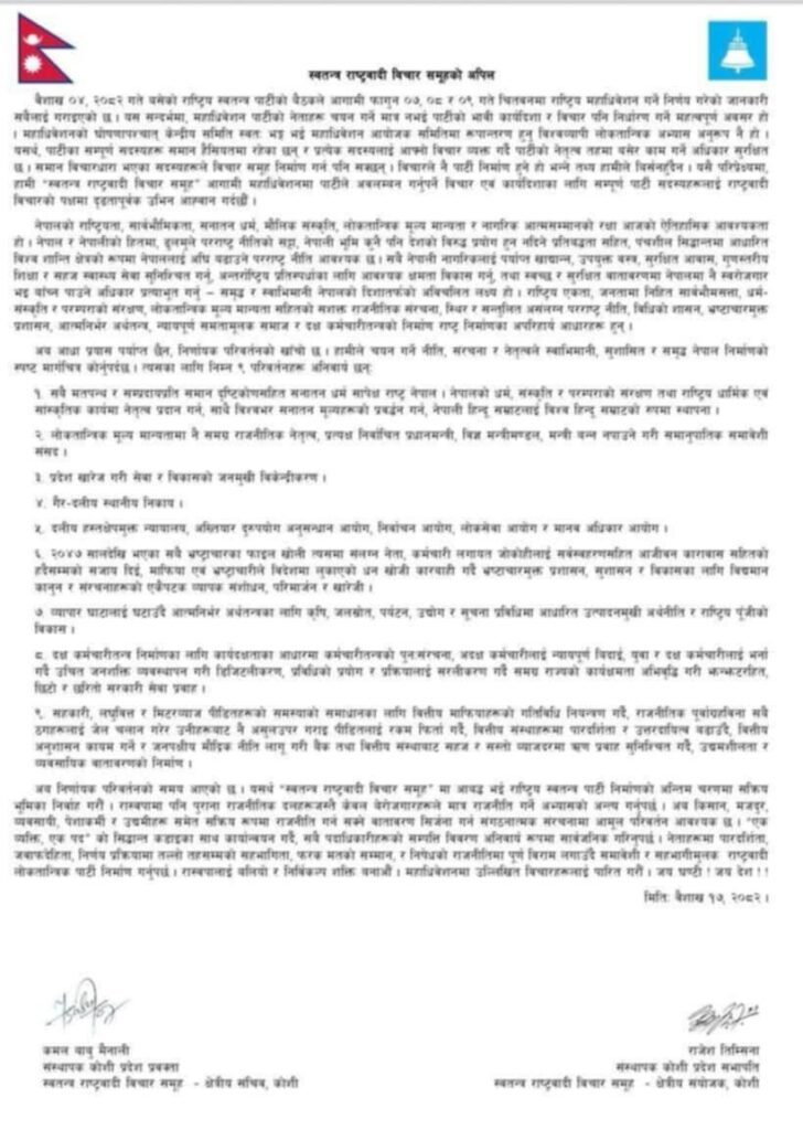 राश्वपालाई गणतन्त्रमा जाने की राजतन्त्रमा भन्ने दुविधा भइरहेका बेला राश्वपा कोशी प्रदेशका प्रवक्ता समेत रहेका कमलबाबु मैनालीले हालै जारी गरेको विज्ञप्तीमा सनातन हिन्दु राज्य र हिन्दु सम्राटका कुरा प्रष्ट खुलाइएको छ । उक्त विज्ञप्तीमा ९ बुँदा हिन्दुराज्यलाई सहयोग पुग्नेगरी अघि सारिएको छ । यस विषयमा राश्वपाको केन्द्रीय कमिटिले भने अहिलेसम्म केही खुलाएको छैन ।