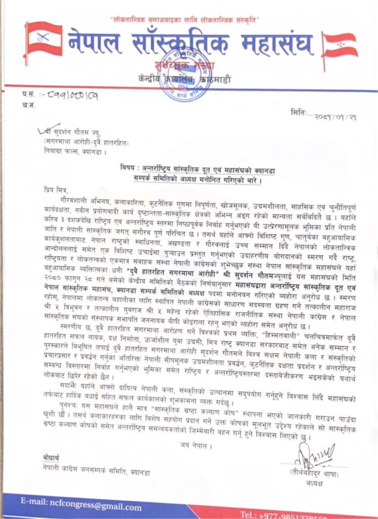 अध्यक्षमा मनोनित गौतम क्यानाडाको मात्र प्रमुख नभएर, संसारभर नै सस्था गठन गर्नुपर्ने ठुलो अभिभारा संगठनले मलाई विशेष कल्चर राजदुतको जिम्मेबारी प्रदान गरेको हुँदा कांग्रेस तथा नेपाल साँस्कृतिक महासंघसंग आस्था राख्नु हुने सम्पूर्णले सम्पर्क गर्न अपिल गरिएको छ ।