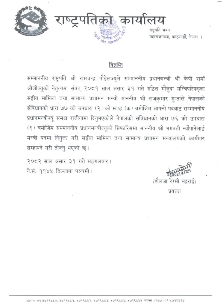 प्रधानमन्त्रीको सिफारिसमा न्यौपानेलाई नियुक्त गरिउको राष्ट्रपतिको कार्यालयले विज्ञप्ति निकालेर जनाएको छ ।