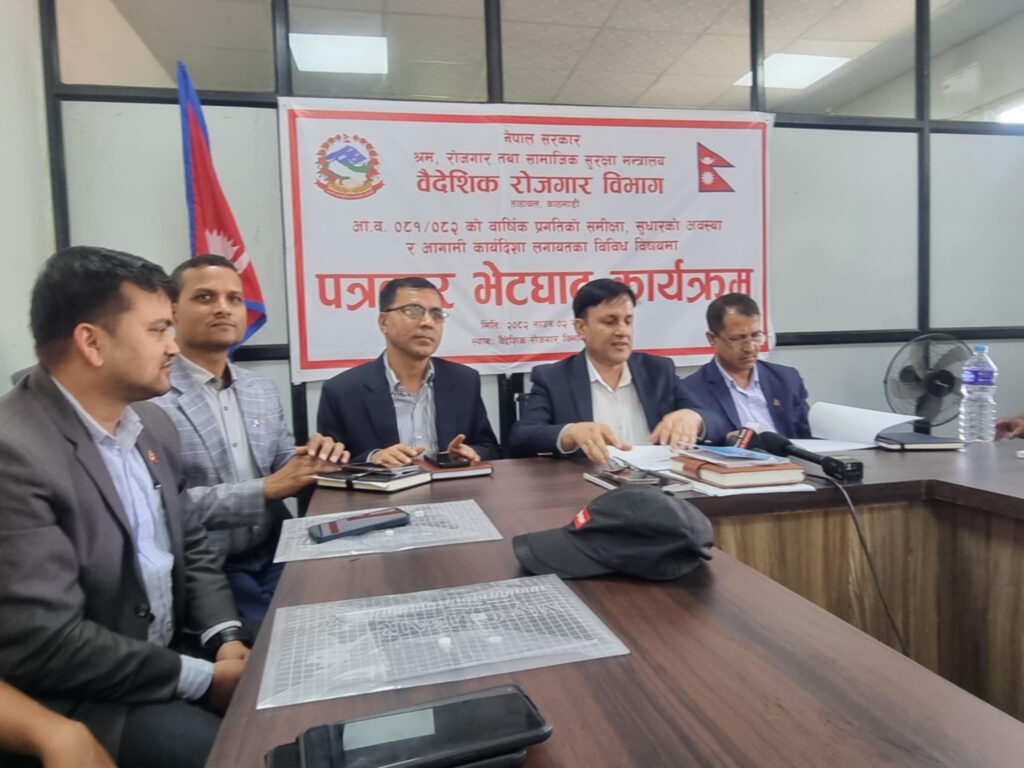 यसै बीच आज शुक्रबार वैदेशिक रोजगार विभागले बार्षिक प्रगति बिबरण सहित वैदेशिक रोजगार क्षेत्र सुधारको लागि बिबिध योजनाबारे जानकारी दिने उदेश्यले पत्रकार भेटघाटको कार्यक्रम आयोजना गरेकाे छ ।