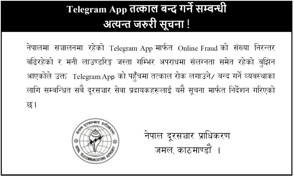 प्राधिकरणले आज एक सूचना जारी गर्दै टेलिग्राम एपको पहुँचमा तत्काल रोक लगाउने बन्द गर्ने व्यवस्थाका लागि सम्बन्धित सबै दूरसञ्चार सेवा प्रदायकहरुलाई निर्देशन दिएको छ ।