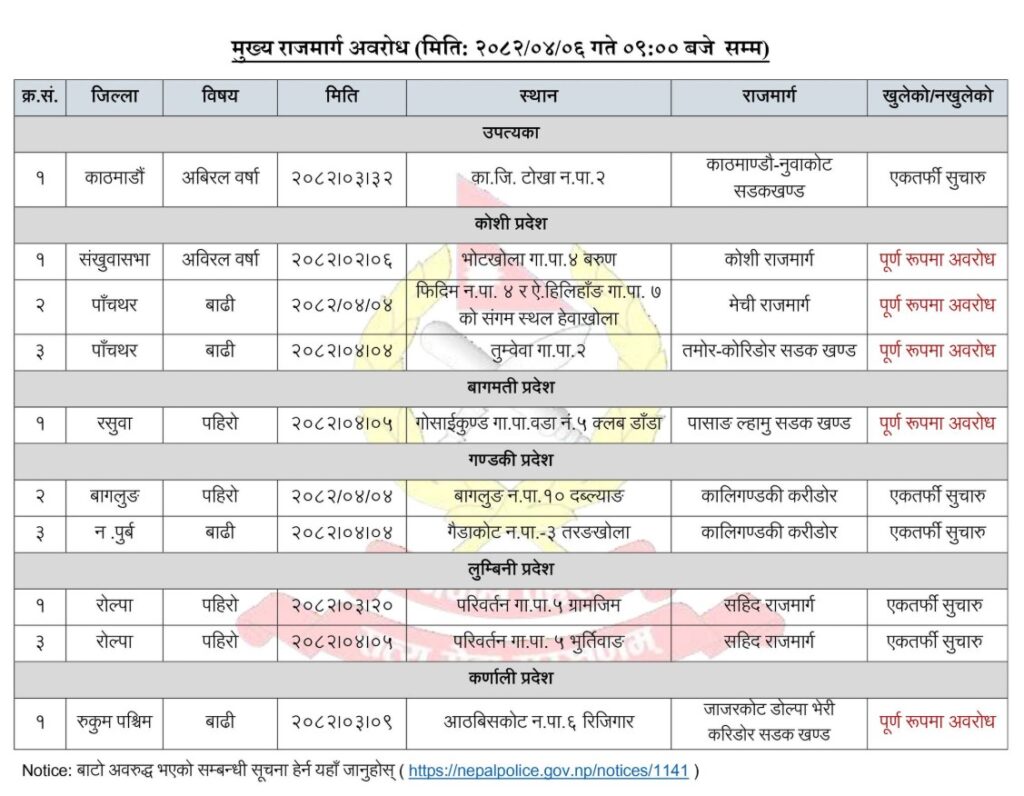त्यसैगरि काठमाडौँको काठमाडौँ–नुवाकोट सडक, बागलुङको कालीगण्डकी करिडोर सडक तथा नवलपरासी पूर्वको कालीगण्डकी करिडोर, रोल्पाको सहीद राजमार्ग एकफर्ती मात्रै खुलेका छन्।