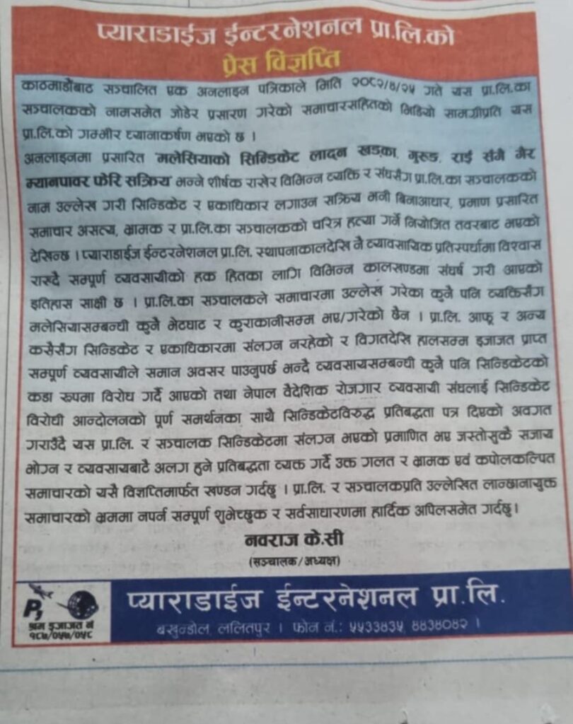 तर केही समययता सरकारी संयन्त्रकै सहयोगमा मलेसिया जाने कामदारमाथि सिमित म्यानपावरले मात्र सिण्डिकेट लगाउन सेटिङ गरिरहेको विषयमा मूलपत्र डटकमले एउटा रिपोटिङ गरेको छ । यही रिपोटिङका क्रममा मूलपत्रलाई प्राप्त सूचनाका आधारमा प्याराडाईज ईन्टरनेशलका सञ्चालक नवराज केसी समेत मलेसियाको सिण्डिकेटमा संलग्न रहेको भनि समाचार प्रकाशन भएको थियो ।