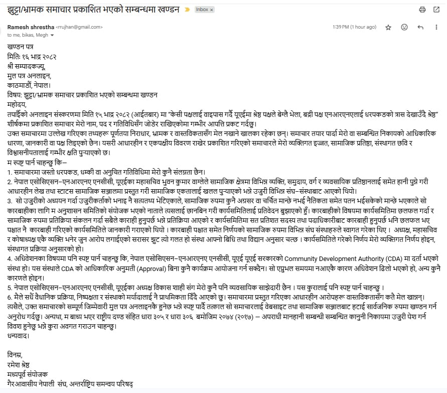 एनआरएनए मध्यपूर्व संयोजक रमेश श्रेष्ठले मूलपत्रमा प्रकाशित समाचार हटाउन विज्ञप्तीमार्फत धम्क्याए
