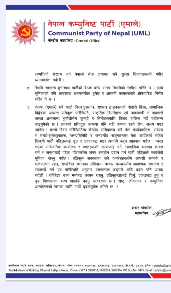 विज्ञप्तीमा भनिएको छ, ‘राजनीतिक समस्याको निकास संविधानसम्मत र लोकतान्त्रिक विधिबाट खोजिनुपर्छ भन्ने पार्टीको अडान हो। स्थानीय तहदेखि संघीय संसद् र न्यायालयसम्म सबै निकायले आफ्नो जिम्मेवारी निर्वाह गरे मात्रै देश स्थायित्व र समृद्धितर्फ अघि बढ्छ।”
