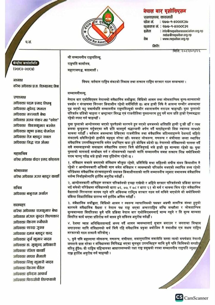 काठमाडौं– नेपाल बार एसोसिएसनले देशमा व्याप्त अनिश्चिततालाई अन्त्य गर्दै शासन व्यवस्थालाई सुचारु बनाउन र जनतामा विश्वास जगाउनका लागि संविधानको मर्म भित्रै रही संवैधानिक प्रक्रिया बमोजिम राष्ट्रिय सरकारको गठन गर्न माग गरेको छ।