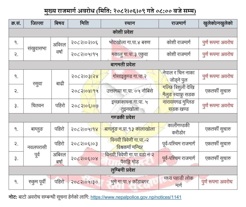 प्रहरीका अनुसार कोशी राजमार्गअन्तर्गत संखुवासभाको भोटखोला गाउँपालिका–४ बरुण र मकालु गाउँपालिका–एकुवामा सडक अवरुद्ध भएको छ ।