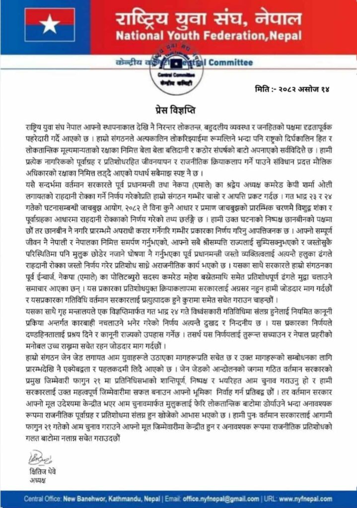 संघले लोकतान्त्रिक मूल्य–मान्यताको रक्षा गर्ने नाममा सरकारले यसरी आधारहीन रुपमा पासपोर्ट रोक्ने कदम चालेको भन्दै यसको तत्काल खारेजी माग गरेको छ। विज्ञप्तिमा भनिएको छ, ‘गएको भदौ २३ र २४ गतेको घटना सम्बन्धी जाँचबुझ आयोग २०८२ ले विना कुनै आधार र प्रमाण जाँचबुझको प्रारम्भिक चरणमै विशुद्ध शंका र पुर्वाग्रहका आधारमा राहदानी रोक्का निर्णय गरेको तथ्य छर्लग्गै छ ।’