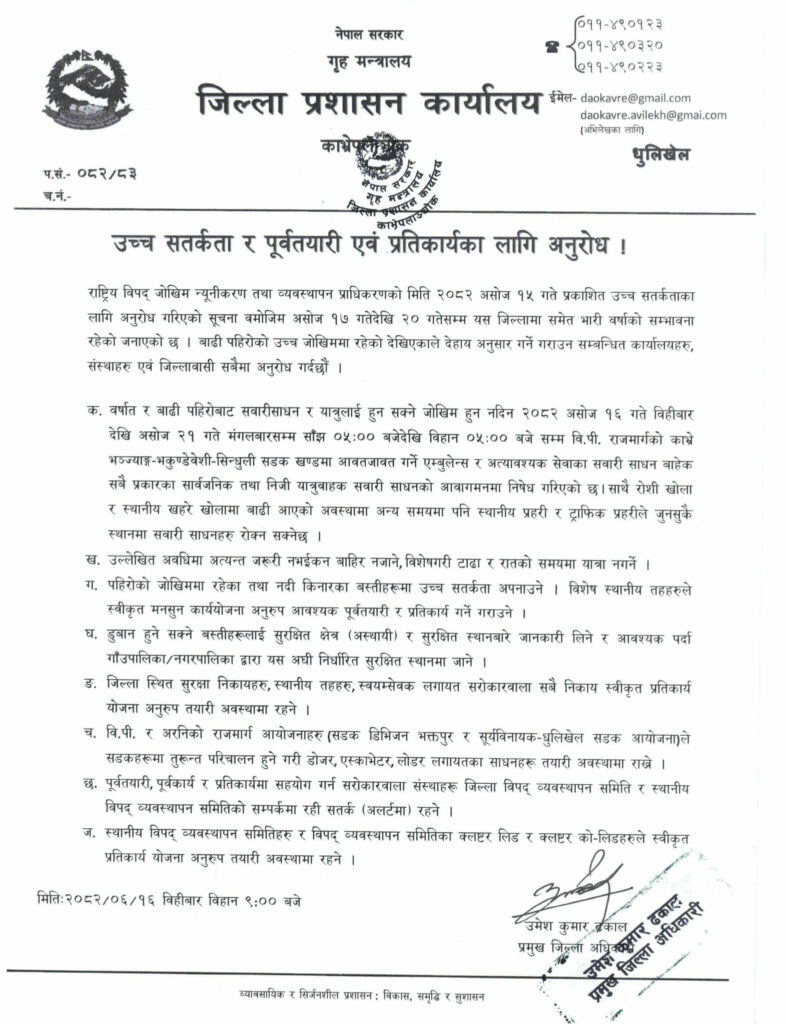 काठमाडौं । राष्ट्रिय विपद् जोखिम न्यूनीकरण तथा व्यवस्थापन प्राधिकरणको सूचना अनुसार भारी वर्षा र बाढी पहिरोको उच्च जोखिम देखिएको भन्दै जिल्ला प्रशासन कार्यालय काभ्रेपलाञ्चोकले बीपी राजमार्गको एक खण्डमा राति सवारी सन्चालनमा रोक लगाएको छ ।