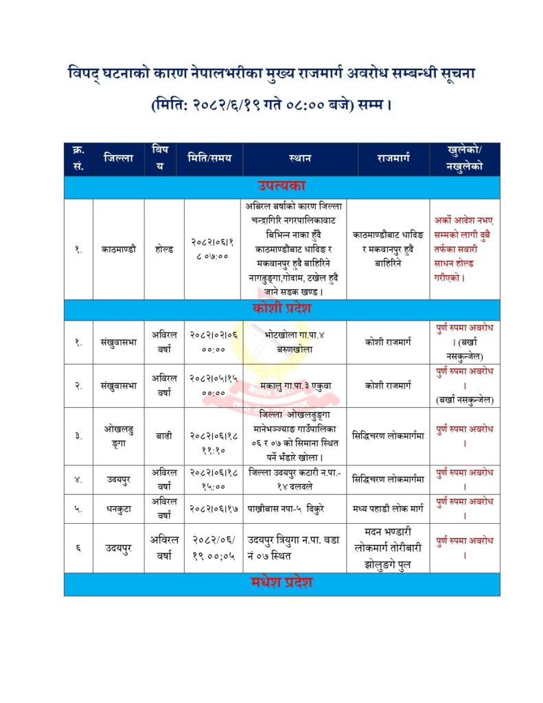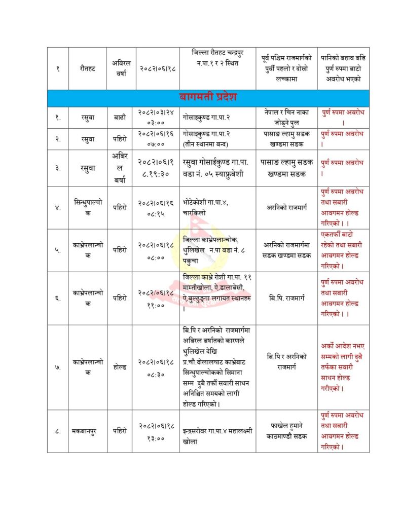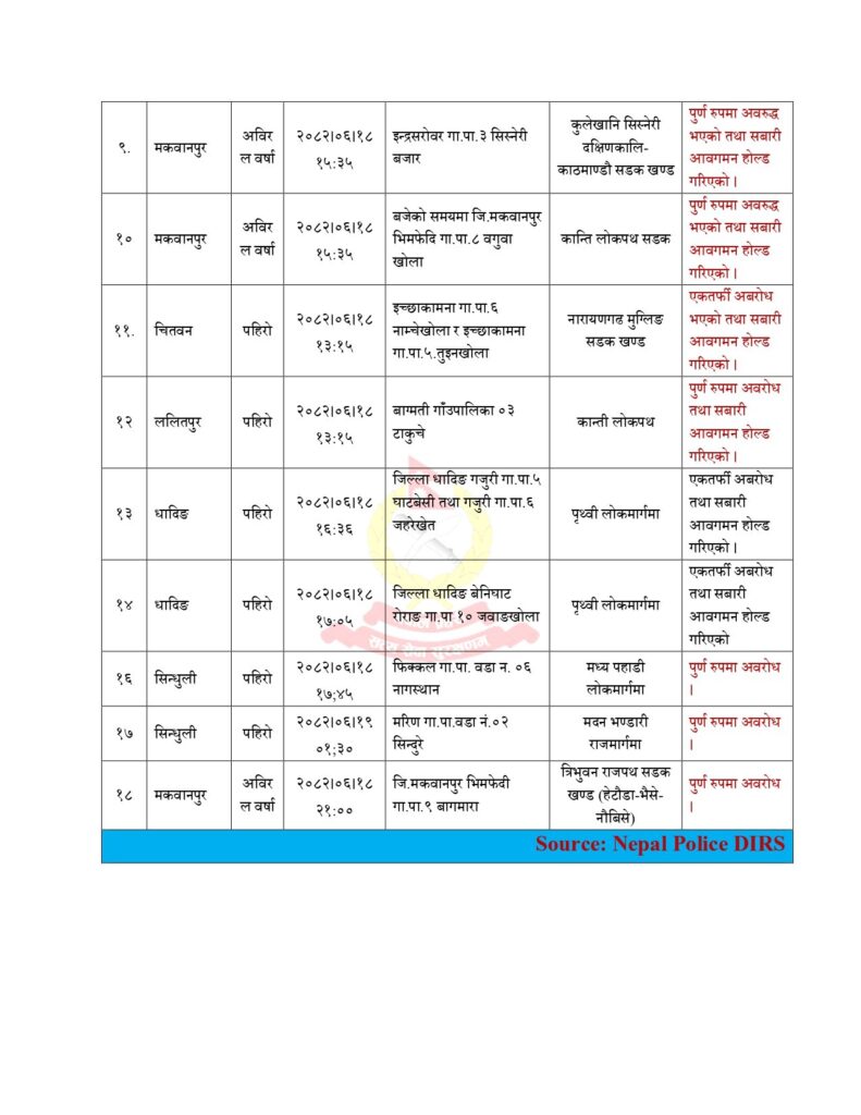 यस्तै मकवानपुरको हेटौँडा–कुलेखानी सडक, चितवनको भरतपुर–ठोरी सडक, ललितपुरको महांकाल गाउँपालिका–५ क्षेत्र, धादिङको गजुरी गाउँपालिका–४ र ५ तथा सिन्धुलीको फिकलडाँडा–पाङ्राङ सडक खण्डमा समेत यातायात सञ्चालन बन्द छ।