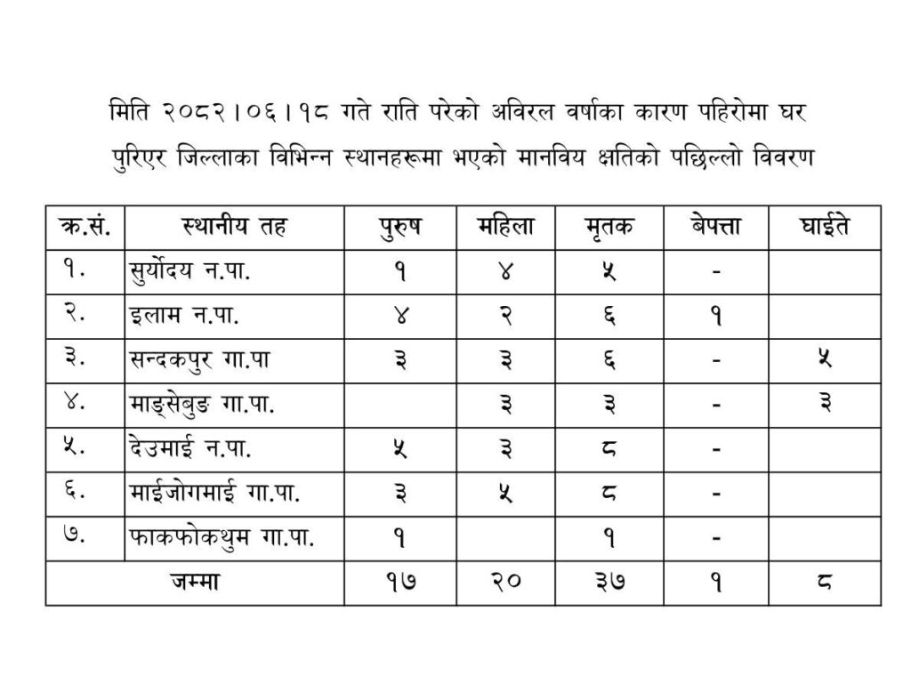 इलाम । शुक्रबार देखि परेको अविरल वर्षाका कारण इलाम जिल्लाका विभिन्न स्थानमा पहिरोमा परि ३७ जनाको मृत्यु भएको छ । विभिन्न स्थानमा गएको पहिरोमा परि ३७ जनाको मृत्य भएको जिल्ला प्रहरी कार्यालयले जनाएको छ ।