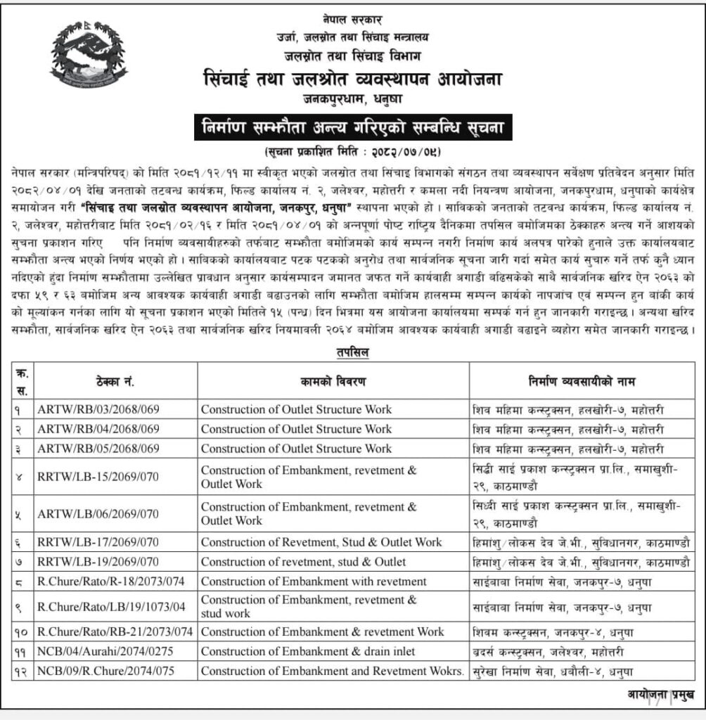 सिँचाइ तथा जलस्रोत व्यवस्थापन आयोजना, जनकपुरधामले व्यवसायीबाट सम्झौताबमोजिम काम सम्पन्न नगरी निर्माण अलपत्र पारेकोले उक्त ठेक्का अन्त्य गरिएको सूचनामा उल्लेख छ ।