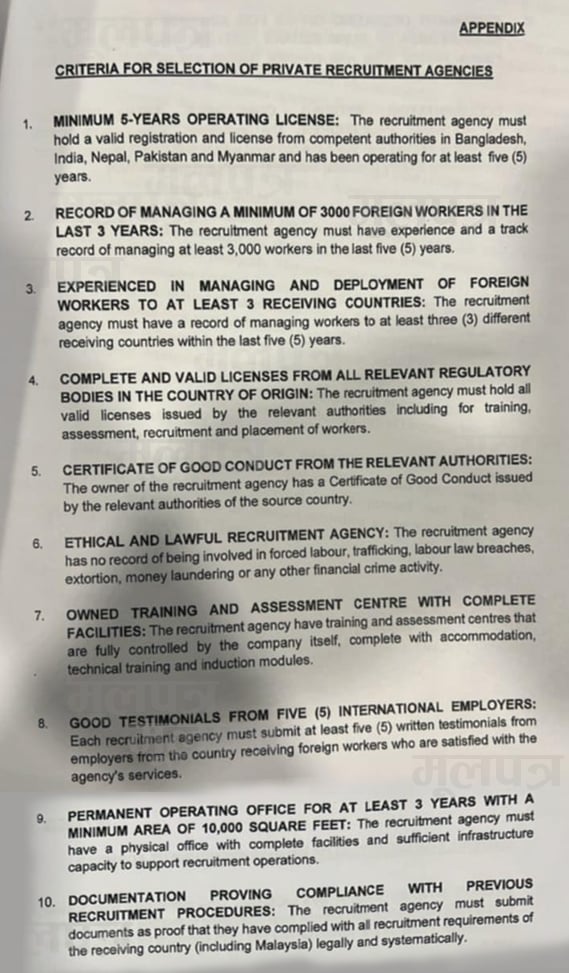 मलेसियाले नेपाललाई पठाएको मापदण्डभित्र म्यानपावरले १० वटा मापदण्ड अनिवार्य रूपमा पूरा गर्नुपर्ने भनिएको छ । इजाजतपत्र लिएको ५ वर्ष हुनुपर्ने, ५ वर्षभित्र कम्तीमा तीन हजार श्रमिक पठाएको हुनुपर्ने, कम्तीमा तीन देशमा श्रमिक पठाएको हुनुपर्ने, १० हजार वर्गफुटमा फैलिएको कार्यालय हुनुपर्ने, म्यानपावर कम्पनी सञ्चालकको असल चरित्रको प्रमाणपत्र भएको हुनुपर्ने, बाध्यकारी श्रम, मानव तस्करी, श्रम कानुनको उल्लङ्घन, मुद्रा अपचलन र अन्य आर्थिक अपराधमा संलग्न नभएको हुनुपर्नेलगायतका मापदण्ड पत्रमा उल्लेख छ ।