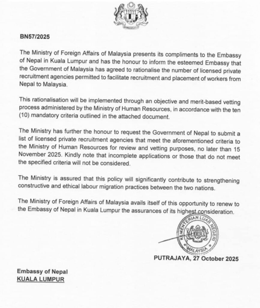 मलेसियाले अदक्ष कामदार लिदैँ आएको स्रोत देशहरू नेपाल, भारत, बङ्गलादेश, पाकिस्तान र म्यानमार सरकारलाई सोमबार एउटै ब्योहोराको पत्र पठाउँदै कात्तिक २९ गते (नोभेम्बर १५) भित्र तोकिएको मापदण्डसहित पत्रचार गरेको छ ।