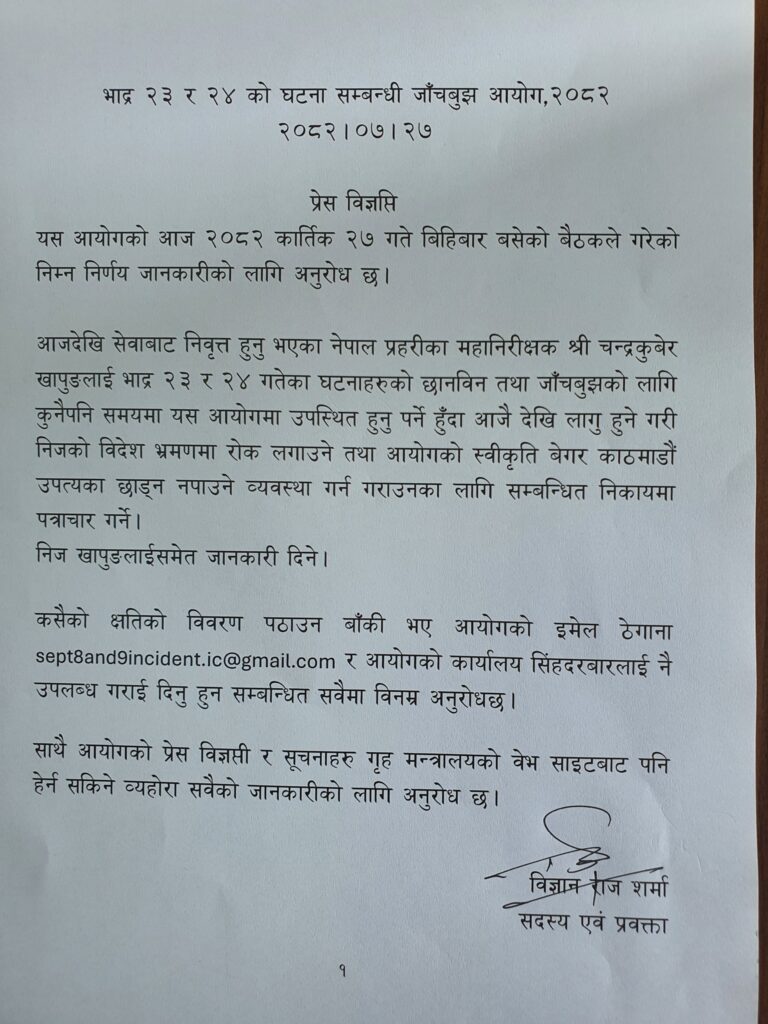 ७५ जनाको ज्यान जाने गरि भएको २३ र २४ भदौमा भएको घटनाको सम्बन्धमा छानबिन गर्न गठित जाँचबुझ आयोगले यस्तो निर्णय गरेको हो। बयानमा जुनसुकै वेला बोलाउन सक्ने भएकाले पूर्वस्वीकृतीविना उपत्यका छाड्नसमेत नदिने निर्णय भएको आयोगका सदस्य विज्ञानराज शर्माद्वारा जारी विज्ञप्तिमा उल्लेख छ।