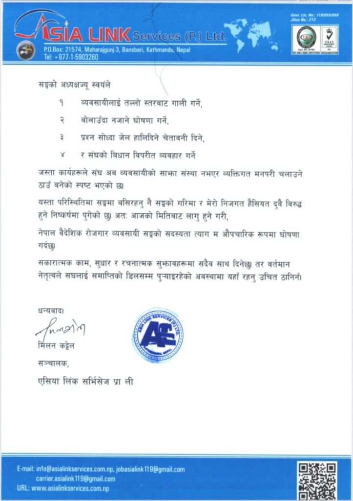 गुरुङको गुण्डागर्दी शैलीप्रति असन्तुष्टि जनाउँदै एशिया लिंकका सञ्चालक कट्टेलले संघको सदस्यता त्यागगुरुङकै कारण संघ विभाजनको संघारमा, जापानको रोजगारीको कमिशनको चक्कर पनि