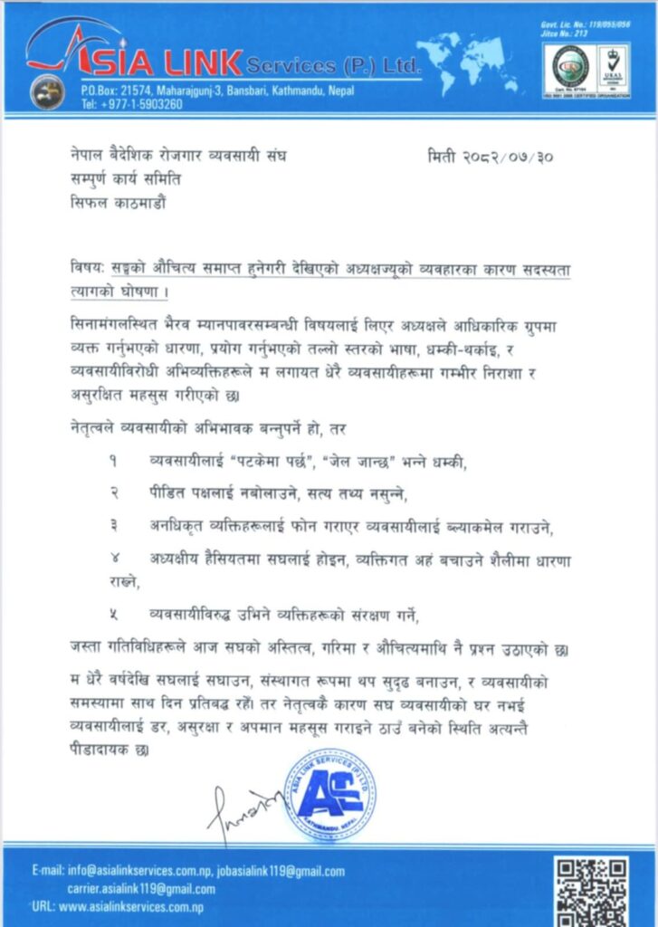 ‘सिनामंगलस्थित भैरव म्यानपावरसम्बन्धी विषयलाई लिएर अध्यक्षले आधिकारिक ग्रुपमा व्यक्त गरेको धारणा र त्यो धारणामा तल्लो स्तरको भाषा, धम्की थर्काइ, व्यवसायीविरोधी अभिव्यक्तिले म लगायत धेरै व्यवसायीहरुमा गम्भीर निराशा र असुरक्षित महसुस गरिएको छ । नेतृत्वले व्यवसायीको अभिभावक बन्नुपर्ने ठाउँमा पटकेमा जेल जान्छ भन्ने धम्की दिने, पीडित पक्षलाई नबोलाउने, सत्य तथ्य नसुन्ने, अनधिकृत व्यक्तिहरूलाई फोन गराएर व्यवसायीलाई ब्ल्याक मेल गराउने, अध्यक्षीय हैसियतमा संघलाई होइन, व्यक्तिगत अहं बचाउने शैलीमा धारणा राख्ने र व्यवसायीविरुद्ध उभिने व्यक्तिहरूको संरक्षण गर्ने आएको छ’, उनले राजीनामा पत्रमा लेखेका छन् ।