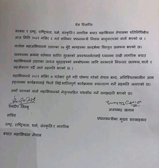 गए राति बालुवाटारमा नेपाल सरकारका तर्फबाट प्रधानमन्त्री सुसिला कार्की, गृहमन्त्री सहितको वार्ता पश्चात बन्द हड्ताल फिर्ता लिने निर्णय गरेको सचिवालयले जनाएको छ ।
