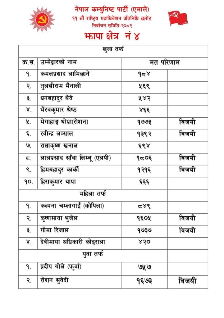 यस्तै झापा क्षेत्र नम्बर ५ मा सोही क्षेत्रका निर्वाचित भएका प्रदेश सभा सदस्य राधाकृष्ण खनाल पनि महाधिवेशन प्रतिनिधिमा पराजित भएका छन् झापा–४ मा एमाले अध्यक्ष केपी ओलीकै प्यालन ११ औँ महाधिवेशनका लागि निर्वाचन भएर आएको छ ।