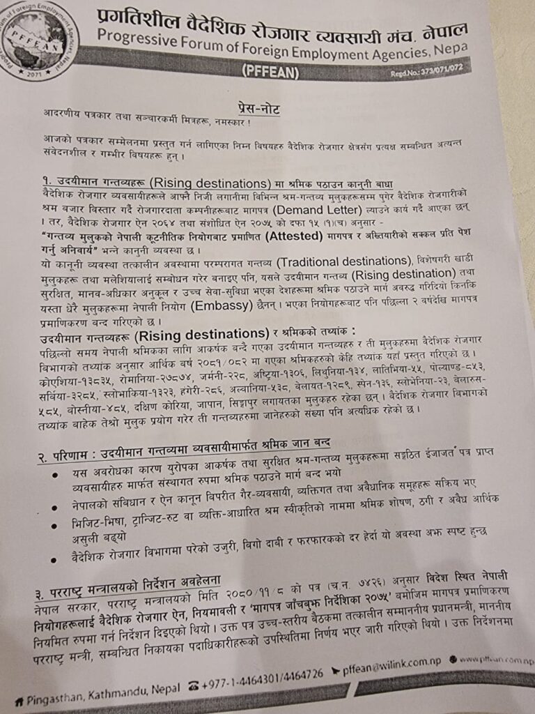 नेपाल सरकार, परराष्ट्र मन्त्रालयले विदेशस्थित नेपाली दूतावास, नियोग, वाणिज्य दूतावासलाई वैदेशिक रोजगार ऐन २०६४ अनुसार मागपत्र प्रमाणीकरण गर्न सकिने व्यवस्था गरेको भए पनि, नियमनका नाममा विदेश मन्त्रालय र विभागको निर्णयविपरीत काम नभइरहेको गुनासो प्रेस नोटमा उल्लेख गरिएको छ ।