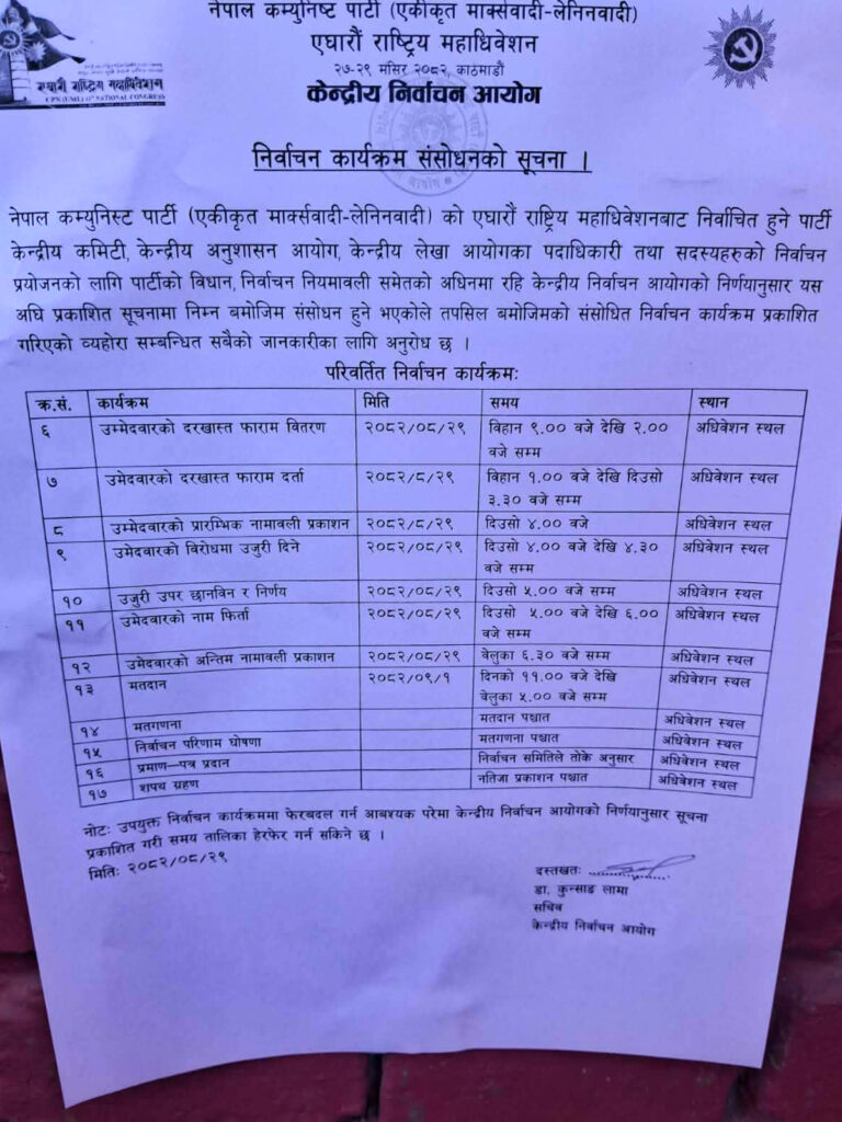 एमालेको निर्वाचन तालिका संशोधन, साढे ६ बजे उम्मेदवारको अन्तिम नामावली प्रकाशन