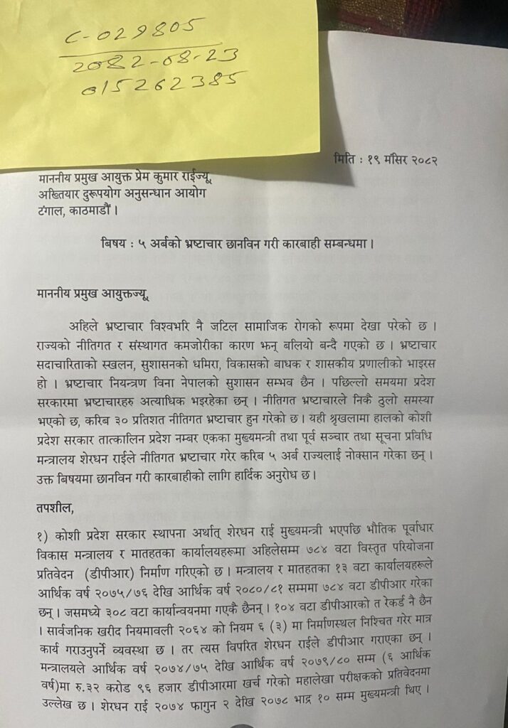महालेखाको प्रतिवेदनमा समेत आर्थिक वर्ष २०७४÷७५ देखि नै ३२ करोड ९६ हजार डिपिआरमा खर्च गरेको र त्यसमा अनियमितता रहेको जनाएको थियो । सोही विषयमा तत्कालीन मुख्यमन्त्री शेरधन राईको सचिवालय मुछिएको पाइएपछि अख्तियारमा उजुरी परेको थियो ।