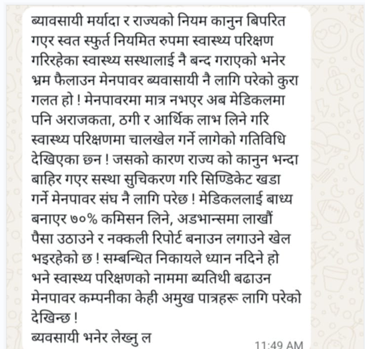 एक मेडिकल सञ्चालकले मूलपत्रलाई पठाएको एउटा स्टाटसमा यस्तो भनिएको छ ।