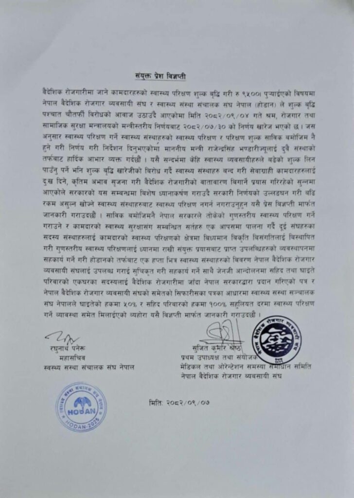 बैदेशिक रोजगारीमा जाने नेपाली श्रमिकहरु लाई आर्थिक भार पर्ने गरि वृद्धि गरिएको स्वास्थ परीक्षण शुल्क लाई खारेज गरि साबिक कै दर÷ रेटमा स्वास्थ परिक्षण गर्न गराउन नेपाल सरकार श्रम रोजगार तथा सामाजिक सुरुक्षा मन्त्रालयको नवनियुक्त मन्त्री श्री राजेन्द्र सिंह भन्डारीको निर्देशन÷ निर्णयप्रति हामी अभार छौ।केही स्वास्थ सस्थाले वृद्धि भएको शुल्क रु. ९५०० नै कायम गर्नुपर्ने भन्दै अनावश्यक बहाना बनाइ स्वास्थ परीक्षण रोकेका छन् । जसले गर्दा विशेषत मलेसिया जाने तयारीमा रहेका हजारौं श्रमिकहरु केही दिन देखि काठमाडौंमा अलपत्र परेका सहमतिमा भनिएको छ ।