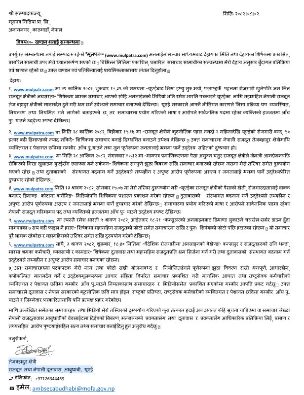 खण्डनमा मिति २८ कार्तिक २०८२, बिहीबार “राजदूत क्षेत्रीले कुटनीतिक पहल नगर्दा २ महिनादेखि यूएईको रोजगारी बन्द, ५० हजार बढी डिमाण्डको म्याद सकिदै” शिर्षिकमा समाचार बनाई दिग्भ्रमित बनाउन खोजेको राजदुतले आरोप लगाएका छन् ।