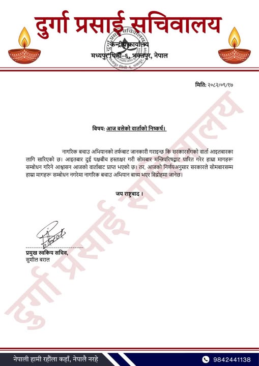 काठमाडौं– प्रधानमन्त्री सुशीला कार्की र नागरिक बचाउ महाअभियानको संयोजक दुर्गा प्रसाईबीच वार्ता सकिएको छ । सिंहदरबारस्थित प्रधानमन्त्री तथा मन्त्रिपरिषदको कार्यालयमा भएको वार्तामा फेरी वार्ता गर्ने सहमति भएको पत्रकारहरुसँग बताएका छन् ।