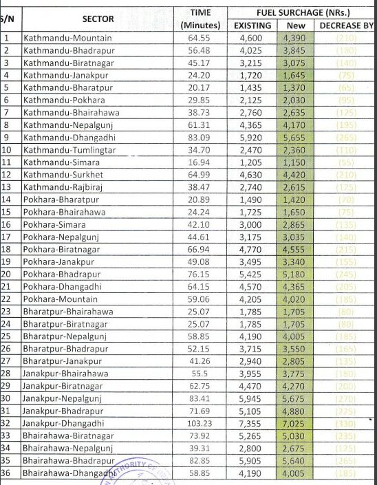 यसैगरी काठमाडौंबाट सुखेत र माउन्टेन फ्लाइटमा २१०–२१० रुपैयाँ, नेपालगञ्जमा १९५ रुपैयाँ तथा भद्रपुरमा १८० रुपैयाँले कमी आएको छ। पोखरा केन्द्रित उडानहरूमा पनि उल्लेख्य राहत देखिएको छ। पोखरा–भद्रपुर रुटमा २४५ रुपैयाँ, पोखरा–धनगढीमा २०५ रुपैयाँ र पोखरा–जनकपुरमा १९० रुपैयाँले इन्धन शुल्क घटेको छ।