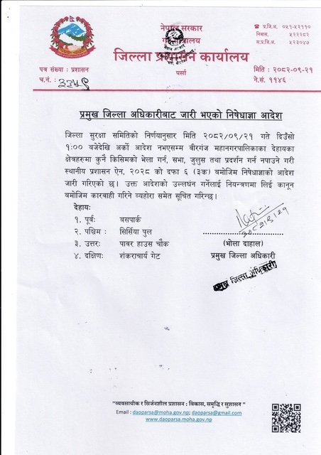 सम्भावित झडपलाई मध्यनजर गर्दै जिल्ला प्रशासन कार्यालय पर्साले वीरगञ्ज महानगरपालिकाका विभिन्न क्षेत्रमा निषेधाज्ञा जारी गरेको छ। जिल्ला सुरक्षा समितिको निर्णयअनुसार सोमबार दिउँसो १ बजेदेखि अर्को आदेश नभएसम्मका लागि संवेदनशील क्षेत्रहरूमा यो आदेश लागू गरिएको हो।