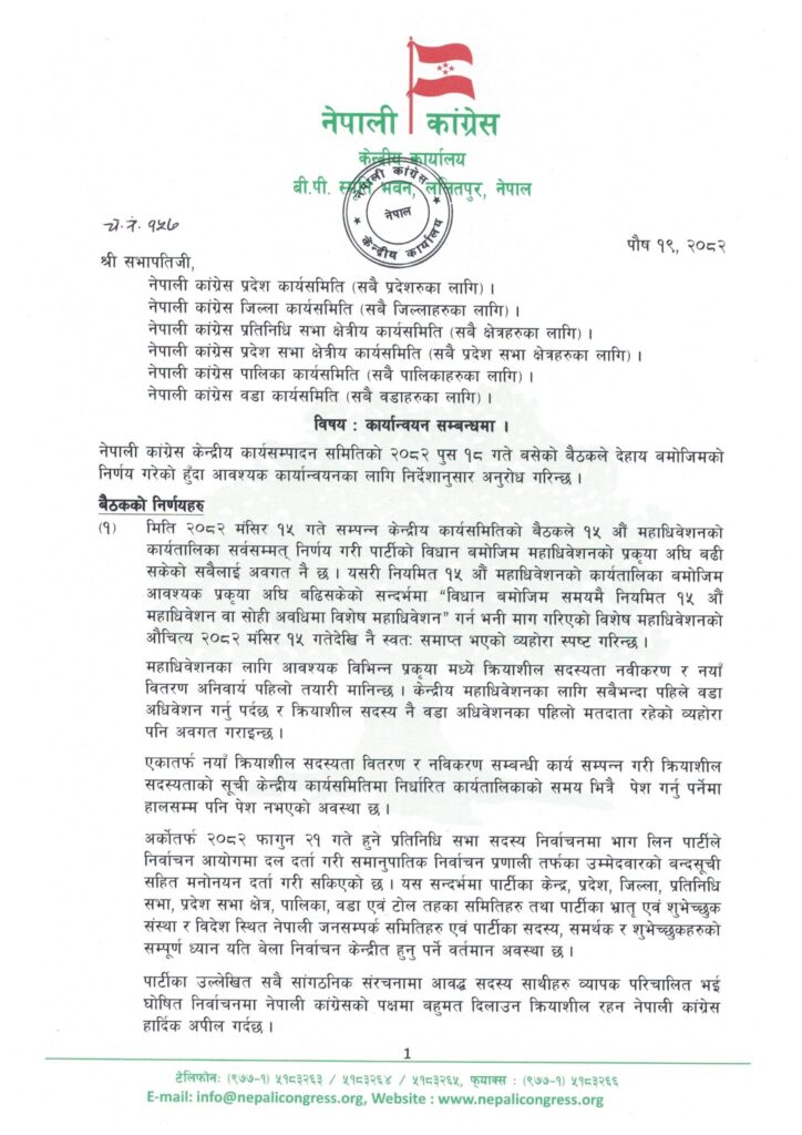 विशेष महाधिवेशन रोक्ने प्रयास स्वरुप कांग्रेसले गर्यो परिपत्र