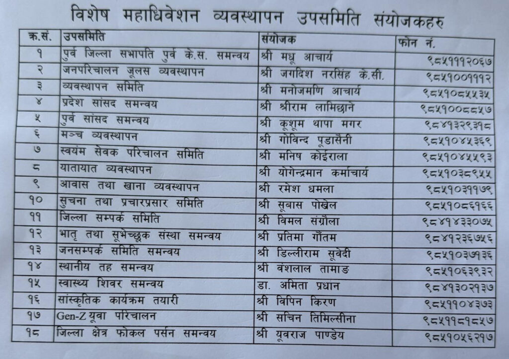 पुस २७ गते भृकुटीमण्डपमा विशेष महाधिवेशन उद्घाटन हुने र महाधिवेशन सफल बनाउन विभिन्न उपसमिति बनाइएको जनाएका छन् ।