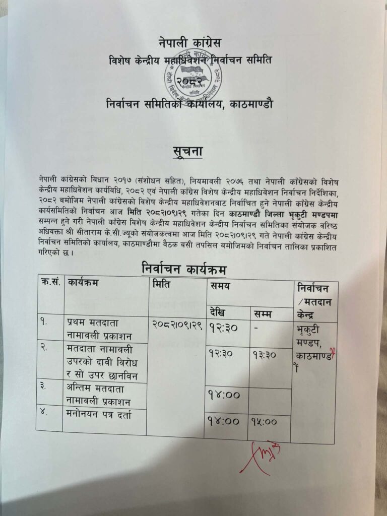 विशेष महाधिवेशनको निर्वाचन कार्यतालिका सार्वजनिक, सभापतिका लागि ३० हजार शुल्क