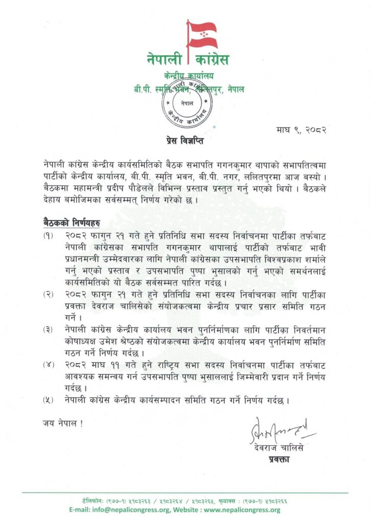काठमाडौँ । नेपाली कांग्रेसको केन्द्रीय कार्यसमिति बैठकले आगामी निर्वाचन केन्द्रित पाँच महत्वपूर्ण निर्णय गरेको छ। शुक्रबार सानेपामा बसेको बैठकले २०८२ फागुन २१ गते हुने प्रतिनिधिसभा निर्वाचनमा सभापति गगनकुमार थापालाई प्रधानमन्त्रीको उम्मेदवार घोषणा गर्ने निर्णय गरेको छ।