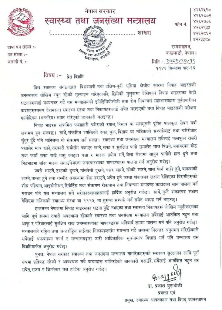 स्वास्थ्य मन्त्रालयले तयार गर्यो निपाह भाइरसको एल्गोरिदम, सचेत रहन सबैमा आग्रह
