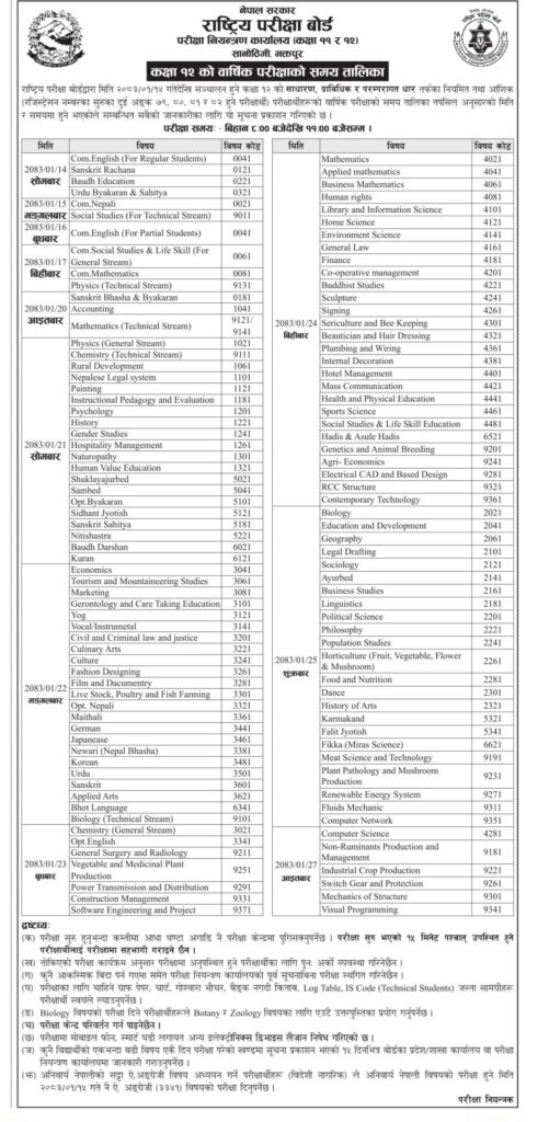 राष्ट्रिय परीक्षा बोर्डले परीक्षाको साधारण, परम्परागत र प्राविधिक विषय समूह तर्फका नयाँ तथा पुरानो पाठ्यक्रम एवं ग्रेड वृद्धि परीक्षाको तालिका सार्वजनिक गरेको छ ।