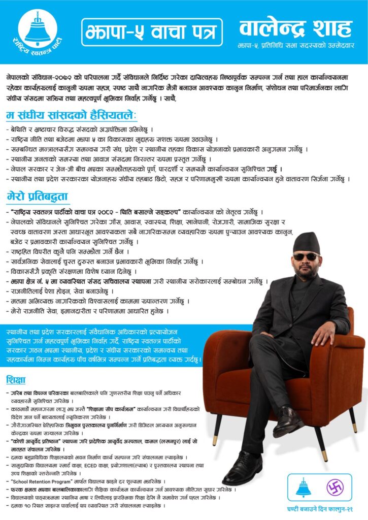 काठमाडौं । फागुन २१ को निर्वाचनमा प्रतिनिधिसभा सदस्यका लागि झापा निर्वाचन क्षेत्र नम्बर ५ बाट उम्मेदवारी दिएका राष्ट्रिय स्वतन्त्र पार्टी (रास्वपा)का वरिष्ठ नेता बालेन शाहले आफ्नो चुनावी बाचापत्र सार्वजनिक गरेका छ ।
