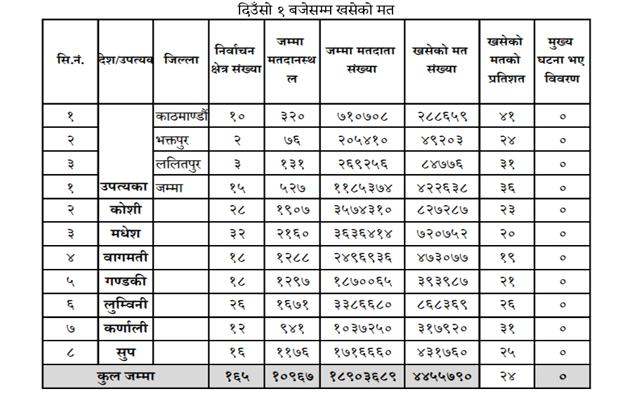 १ बजेसम्मको अवधिमा ४४ लाख ५५ हजार ७९० मत खसेको हो । सबैभन्दा बढी काठमाडौं उपत्यकामा ३६ प्रतिशत मत खसेको छ ।