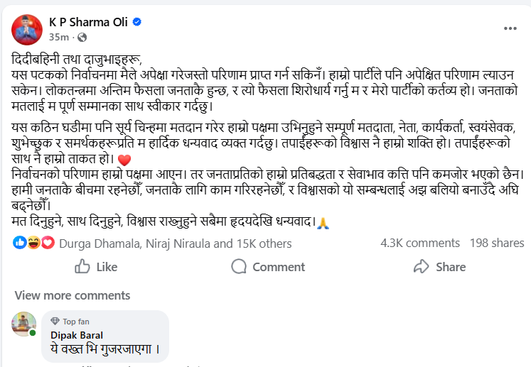 काठमाडौं । नेकपा एमालेका अध्यक्ष केपी शर्मा ओलीले सामाजिक सन्जाल फेसबुक मार्फत लोकतन्त्रमा अन्तिम फैसला जनताकै हुने बताएका छन् । चुनावी पराजयपछि पहिलोपटक सार्वजनिक वक्तव्य जारी गर्दै जनताको फैसला शिरोधार्य गर्ने बताएका छन् ।