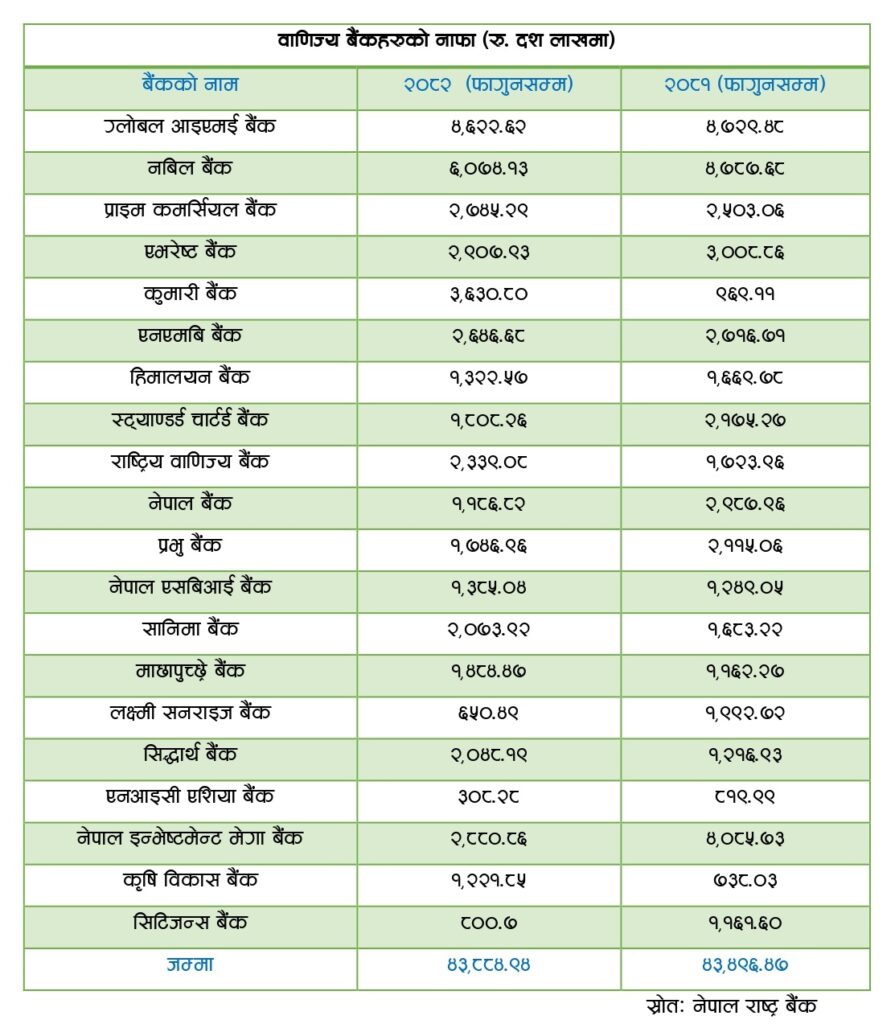 नेपाल राष्ट्र बैंकले सार्वजनिक गरेको चालू आर्थिक वर्षको फागुन मसान्तसम्मको वित्तीय विवरण अनुसार यस अवधिमा वाणिज्य बैंकहरुले ४३ अर्ब ८८ करोड रुपैयाँ नाफा कमाएका छन् । जबकी गत आर्थिक वर्षको सोही अवधिमा बैंकहरुले ४३ अर्ब ४९ करोड रुपैयाँ नाफा कमाएका थिए ।