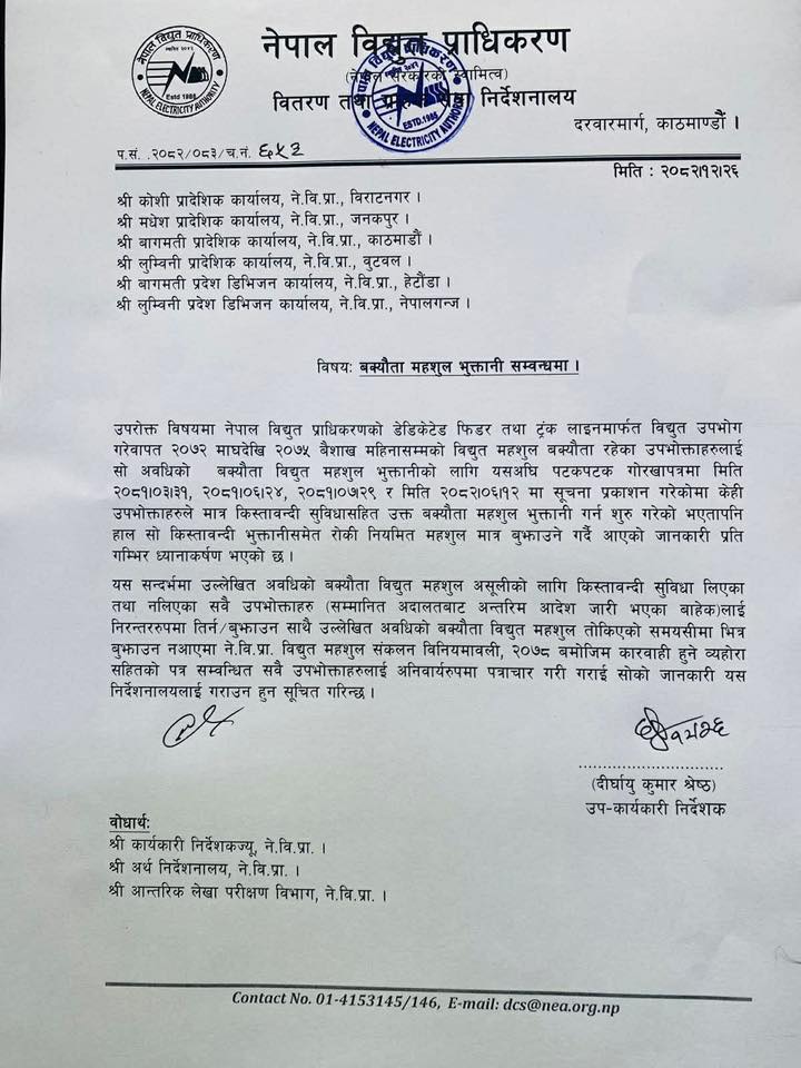 ‘यस सन्दर्भमा उल्लेखित अवधिको बक्यौता विद्युत् महसुल असुलीको लागि किस्ताबन्दी सुविधा लिएका तथा नलिएका सबै उपभोक्ताहरू ९सम्मानित अदालतबाट अन्तरिम आदेश जारी भएका बाहेक० लाई निरन्तर रूपमा तिर्नरबुझाउन साथै उल्लेखित अवधिको बक्यौता विद्युत् महसुल तोकिएको समयसीमा भित्र बुझाउन नआएमा ने।वि।प्रा। विद्युत् महसुल संकलन विनियमावली, २०७८ बमोजिम कारबाही हुने ब्यहोरा सहितको पत्र सम्बन्धित सबै उपभोक्ताहरूलाई अनिवार्य रूपमा पत्राचार गरी गराई सोको जानकारी यस निर्देशनालयलाई गराउन हुन सूचित गरिन्छ ।’