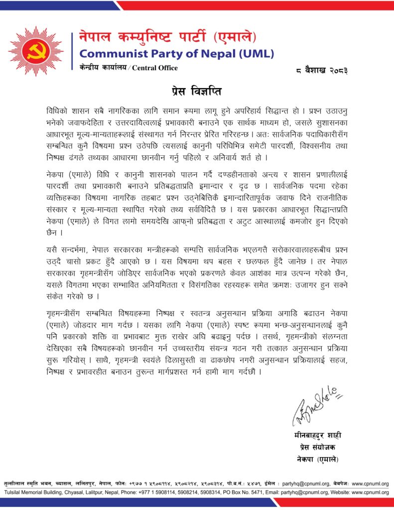 एमाले विधि र कानुनी शासनको पालन गर्दै दण्डहीनताको अन्त्य र शासन प्रणालीलाई पारदर्शी तथा प्रभावकारी बनाउन इमान्दार रहेको समेत विज्ञप्तीमा भनिएको छ । सार्वजनिक पदमा रहेका व्यक्तिहरुका विषयमा नागरिक तहबाट प्रश्न उठ्नेवित्तिकै इमान्दारीतापूर्वक जवाफ दिने राजनीतिक संस्कार एमालेले स्थापित गरेको भन्दै गृहमन्त्रीको सार्वजनिक भएको सम्पत्ति र सम्भावित अनियमितताहरुको खोजी गर्न मार्गप्रशस्त गर्न माग गरेको छ ।