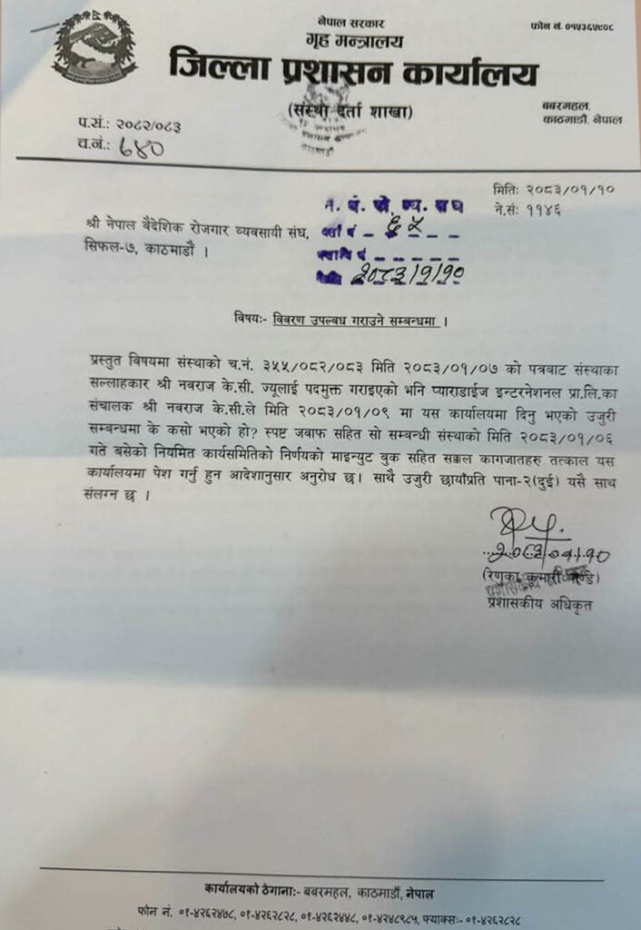 संघका सल्लाहकारलाई हटाएको विषयमा गुरुङलाई काठमाडौं जिल्ला प्रशासन कार्यालयलले पत्र काटेको हो ।