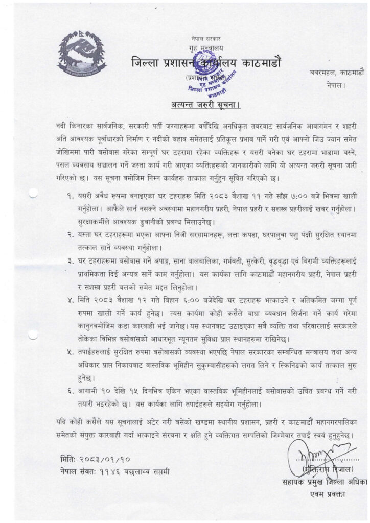 काठमाडौँका सहायक प्रमुख जिल्ला अधिकारी मुक्तिराम रिजालले जारी गरेको सूचनामा नदी किनारका सार्वजनिक, सरकारी पर्ती जग्गामा भएका घर टहरा खाली गरिने जनाइएको छ। यसका लागि शुक्रबार साँझ ७ बजेसम्म घर टहरा खाली गर्न भनिएको छ।